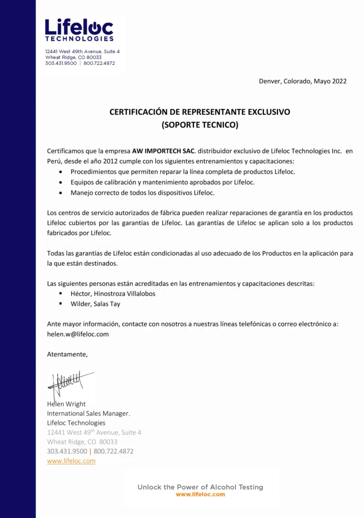 En Perú, somos los únicos representantes autorizados por la casa matriz LIFELOC Technologies, lo que nos permite ofrecer un servicio exclusivo de calibración y mantenimiento de alcoholímetros. Con el paso del tiempo, es esencial realizar este servicio anualmente para asegurar el correcto funcionamiento y la precisión de las pruebas. Contamos con un laboratorio especializado y personal profesional acreditado, respaldado directamente por la casa matriz.