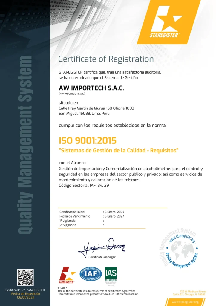 Los alcoholímetros evidenciales LIFELOC, son sometidos a un proceso minucioso y completo de calibración y verificación; cumplimos con los estándares de fábrica, estándares internacionales de la OIML y la Norma Metrológica Peruana NMP 012.